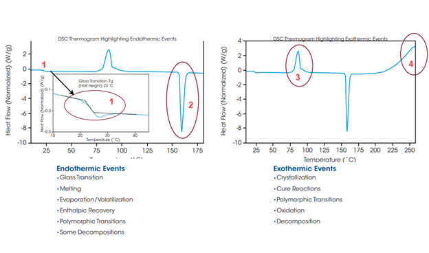 A typical DSC graph consists of normalized heat flow on the y-axis and temperature on the x-axis. As the material experiences exothermic and endothermic reactions, transition regions marked by peaks and slope differences appear and can be analyzed using the provided software to characterize the material.