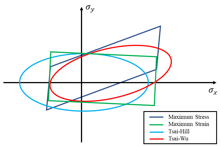 With a maximum stress criteria, the shape of failure surface is a simple orthogonal failure surface when plotted in terms of stress components. Similar to the maximum stress criterion but based on strain values instead of stress, the failure surface in maximum strain criteria is typically represented as an orthogonal box when plotted in stress space. The Tsai-Hill failure surface is elliptical (or ellipsoid in 3D stress space). This criterion accounts for stress interactions by considering the combined effects of normal and shear stresses in the material's failure, which leads to a more complex failure surface. The Tsai-Wu failure surface is generally ellipsoidal in 3D stress space and more complicated than the Tsai-Hill surface. It accounts for more material parameters (including interaction terms between normal and shear stresses) and has a higher degree of interaction between stresses. As can be observed in the figure below, different failure theories will produce different results, which emphasizes the importance of selecting an appropriate theory for a given application.