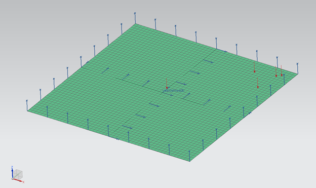 The same analysis setup was employed, but additional forces were applied near the corner to induce nearby shear stresses. The analysis setup is shown in the Figure 3. The following tables provides the stresses in Ply 1 for this particular setup and the strength ratios. We can see that the shear stress is now a significant component of the total stress. The strength ratio for the maximum stress criteria is now based on the shear stress, but does not take into consideration the longitudinal or transverse stresses. This causes the strength ratio value for the maximum stress criteria to be higher than for the other failure theories. This is because the other failure theories all consider the interaction effects between the longitudinal, transverse, and shear components.