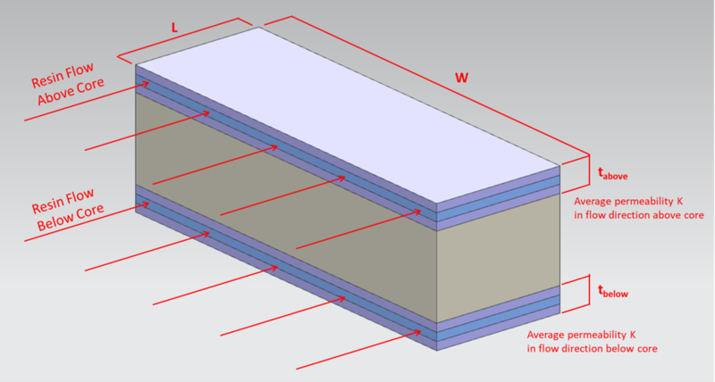 Core materials are widely used in composite components to provide additional stiffness at minimal weight. When evaluating the infusion of a sandwich panel, the flow above and below the core must be considered. This applies to each of the variables in Darcy’s law.