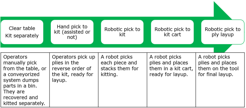 Several automated picking systems have been developed over the last few years. Typically the systems required large reach robotic arms or gantry systems that move across the cutting table and cut nest, picking plies in the correct order and stacking them in a kit for layup. All are expensive, and to date, slower than a human. The use of robots also complicates the assistance of humans to help the process. Cobots will likely make this more accessible. Robotic systems typically kit to a tray, that can be in a kit cart. Several advanced systems are available from Airborne (NL), ARM Automation (Austin, Tx). Some features that exist include ply inspection, automatic kit cart loading. Uncut fibres in a cut nest can cause a pull up of the whole nest if there isn’t a proper verification system in place. Depending on the system, some systems are not able to pick large and small plies from the same head.