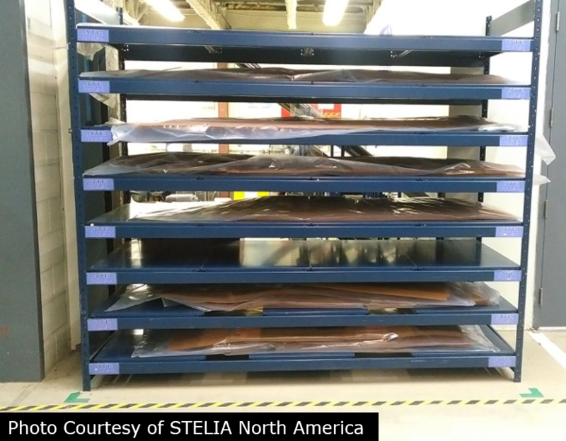 Once a piece is cut, it is grouped with other plies that make up the same part. This compilation of plies is then sorted in the freezer for future use, the process of creating these compilations is referred to as kitting.