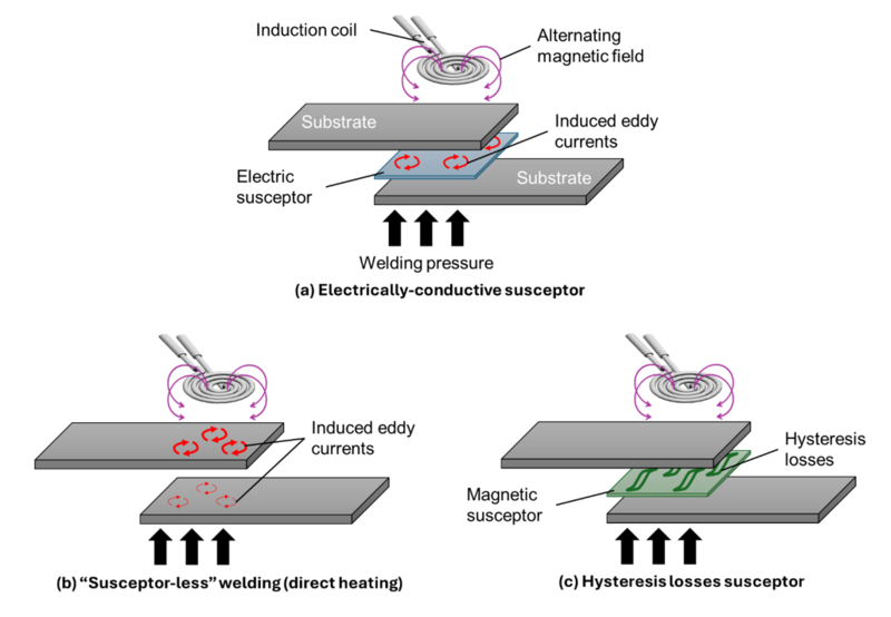 Induction welding is an electromagnetic thermoplastic welding process relying on the application of an alternating magnetic field to generate heat at the joining interface. Heat can be generated directly in the substrates to be welded if they are electrically conductive or if a heating element is placed at the joining interface called a susceptor, which can heat up when subjected to an alternating magnetic field.