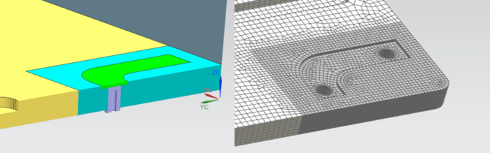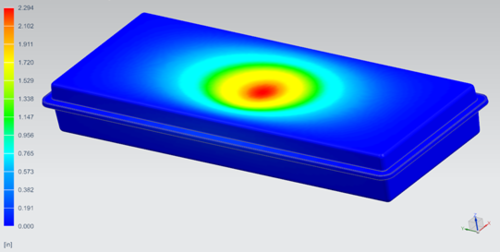It was critical that the lid did not touch the batteries when deflected. However, the maximum height of the enclosure was limited based on clearance with other vehicle systems. These limitations defined the maximum allowable deflection. Figure 1 shows the initial deflection results for the external lid load applied to the composite design. The deflection exceeded the allowable limit, so the design was adjusted. In this case, a core material was added to the lid to make it stiffer. The analysis was repeated, revealing that the deflection had been reduced by over tenfold and now fell within the acceptable range.