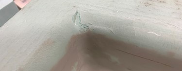 During the demould process, the foam was too soft to pry against and resulted in some damage to the sealing resin coat on the top surface. Some areas were cracked due to pressure exerted when prying the part up, see example in the figure below, while other areas saw the sealing resin coat peeled off due to interactions with the flashbreaker tape.