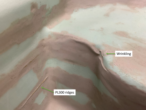 The foam exhibited peculiar behaviour after the completion of the layup. Some areas of the tool experienced wrinkling, forming ridges and wrinkles that can be seen in the part. Some of these ridges occur near the PL300 adhesive areas as show in the figure below. It is likely that these defects are caused by the exotherm of the cure, the pressure from the vacuum or both.