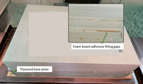 The foam block was delivered to the UBC Materials Engineering Machine Shop for CNC milling of the cavity. The machinists attached a sheet of 1.75 cm [11/16”] thick plywood to bottom of the foam block using PL300 foam block adhesive as a base plate to mount the block in the CNC milling machine. The machinists mentioned that the PL300 adhesive would fill up the grooves in the cutting tool, hindering cutting and causing them to pause the machine to clean the cutting tool.