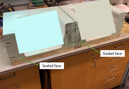 As seen in the figure below, one face of the split was sealed using the same West System Epoxy system while the other had a laser cut gasket adhered using the resin as well. Note: details of the part geometry are intentionally obscured in the figures.