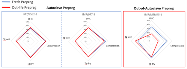 - Mechanical performance: under fresh conditions, OOA and autoclave laminates had comparable open-hole compression (OHC) and strength of 335-374 MPa. Out-of-life OOA laminates lost more than 50% of OHC strength, while autoclave systems showed only modest drops.