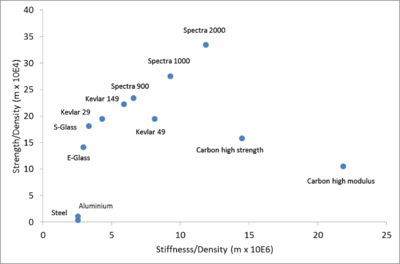 Below is a table roughly comparing the different properties of fibres relative to each other. This can be used as a guide to narrow down the search for fibre types. There is also a graph showing the specific strength vs stiffness for various fibre types, as well as steel and aluminum, to show how there is variation within the fibre types as well.