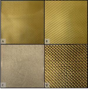 Fibre is also commonly available in woven mats or broad goods, commonly referred to as fabric. This is typically available with a thickness of 0.13 - 0.38mm (0.005 - 0.15inches)[1]. During fibre production, individual fibre is gathered into "tows", or "rovings", which are bundles of fibre that are used to weave a fabric. The amount of fibre in a tow is in the thousands and is categorized by how many thousands in each tow, indicated by 'K'. The common sizes are 3K, 6K, 12K and 48K[1]. The weave can be specified to provide more stiffness in a certain direction, this is done by having more fibre in either the warp or the waft direction. See figure for examples of types of fabric. Image A shows an example of aramid fibre in a plain weave, where the tows alternate going above and below each other. Image B shows a satin weave, one tow over and three under, providing more stiffness in a certain direction and good drapeability over curved surfaces. Image C shows a chopped strand mat, which is composed of short fibre that are randomly distributed and held together with a binder that is soluble to styrene. The stiffness properties will be lower due to the discontinuous fibre and lower fibre volume fraction, but the resulting product will be more or less fully isotropic in-plane. It is also possible to combine fibre types as seen in image D.